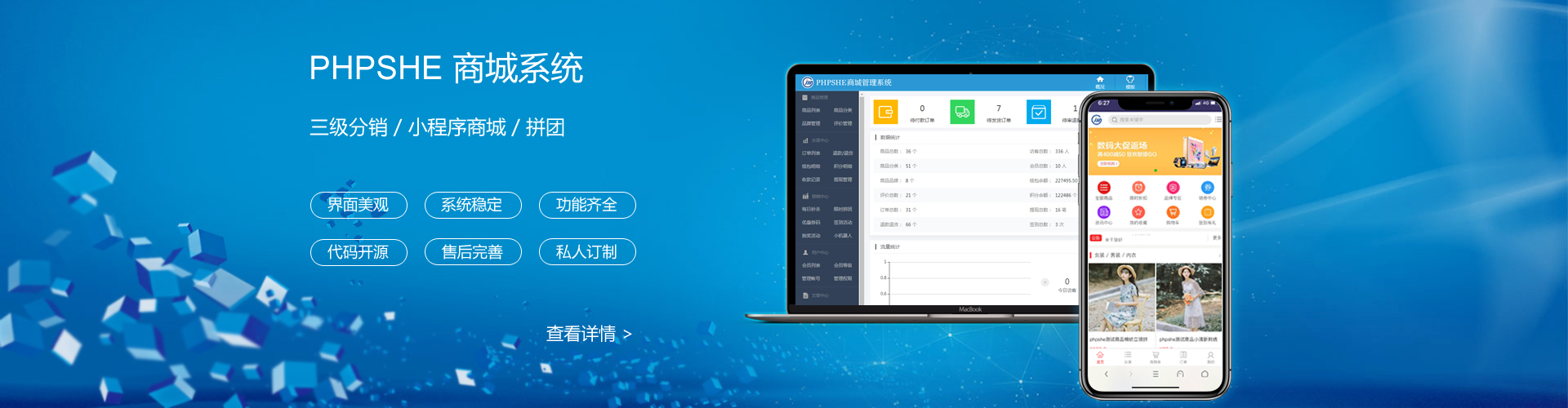 PHPSHE是一款支持三級分銷的商城系統(tǒng), 支持自營、聯營、招商等多種運營模式,并擁有零售、拼團等多種業(yè)務模式,幫助企業(yè)低成本快速構建在線商城,在PC、APP、微信等環(huán)境下開啟電子商務業(yè)務。